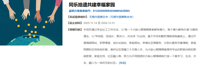 期待您伸出援手,用点滴捐款为大龄心智障碍者搭建技能课堂、筑牢成长阶梯,助力他们习得谋生本领、打破隔阂壁垒,在关爱中站稳脚跟、在包容中绽放价值,与我们共赴温暖有爱的社会,让每一分努力都被看见,让每一个梦想都有回响!